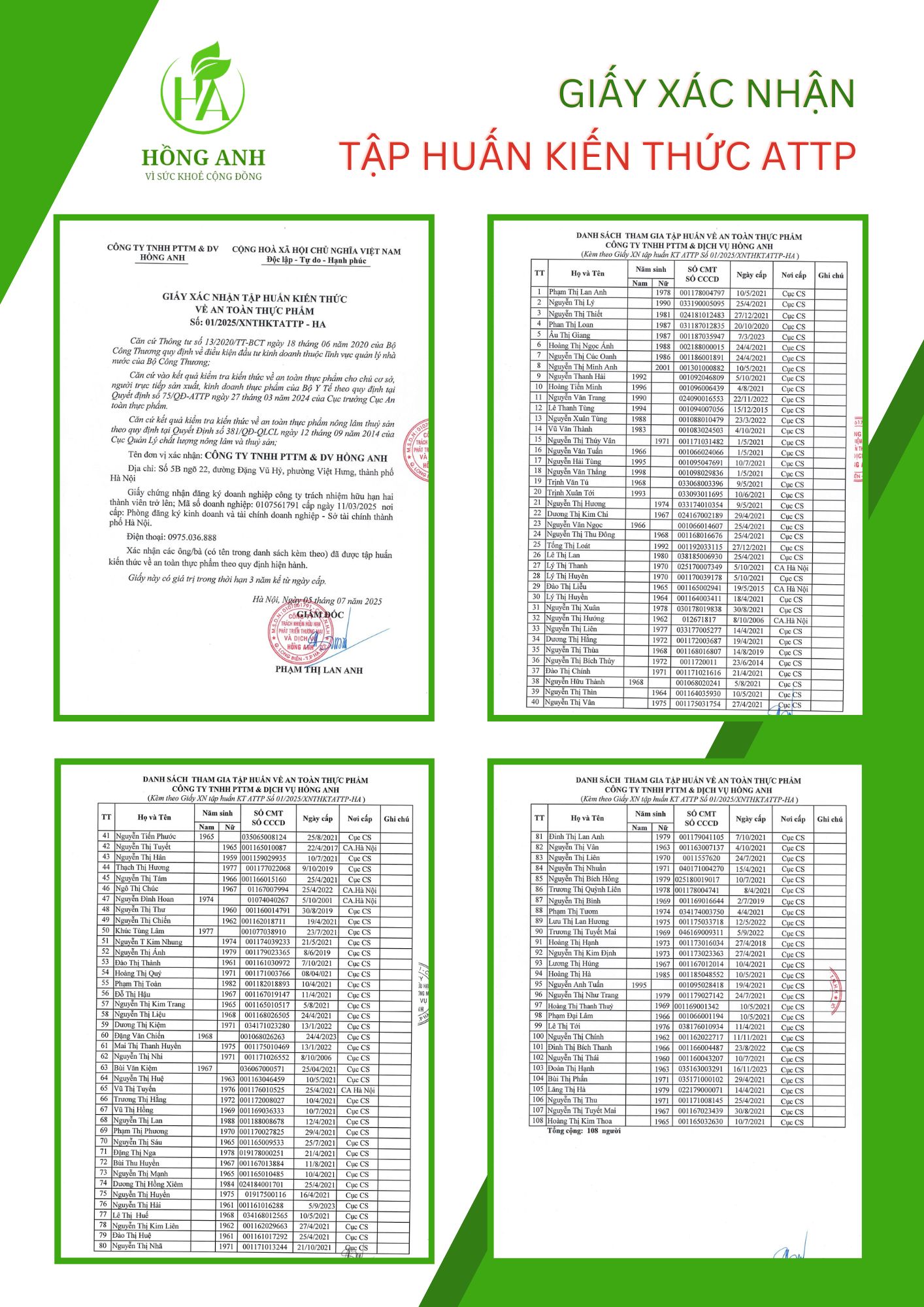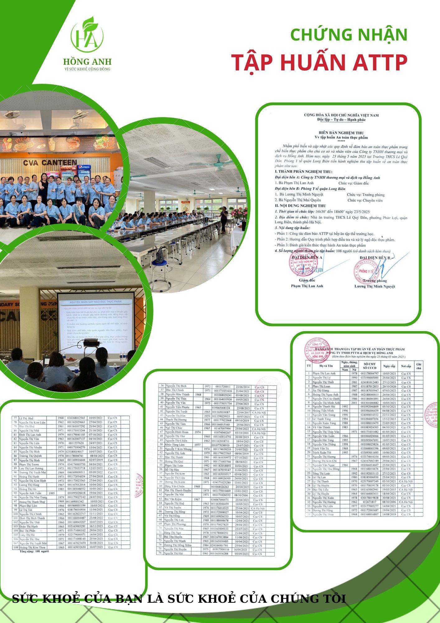 Được chúng nhận đủ điều kiện VSATTP và thông qua huấn luyện, đào tạo, giám sát, chuyên môn và VSATTP bởi đội ngũ kiểm soát chất lượng và vinh dự mời được phòng Y tế Quận Long Biên về tập huấn cho tất cả nhân sự của Công ty.