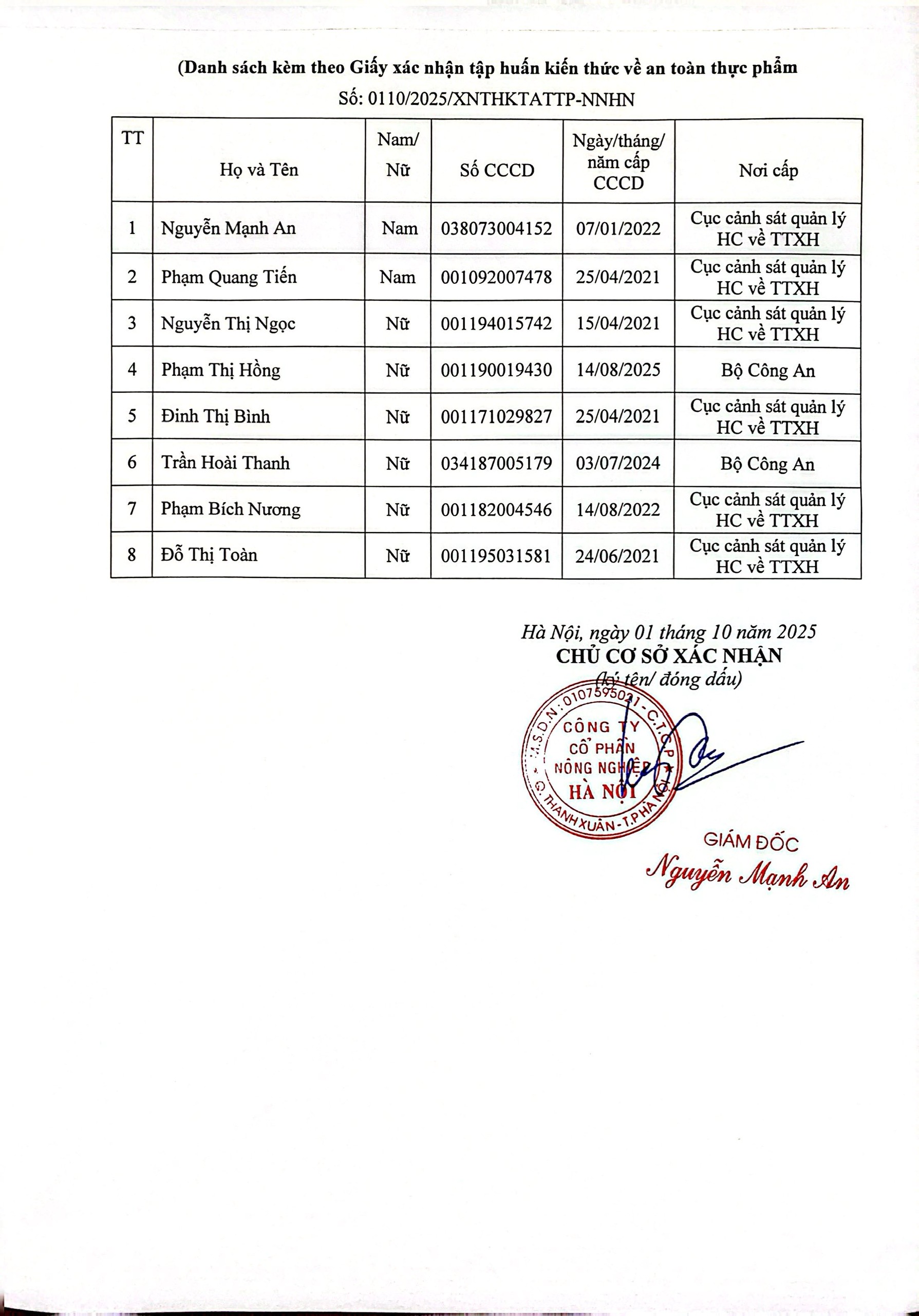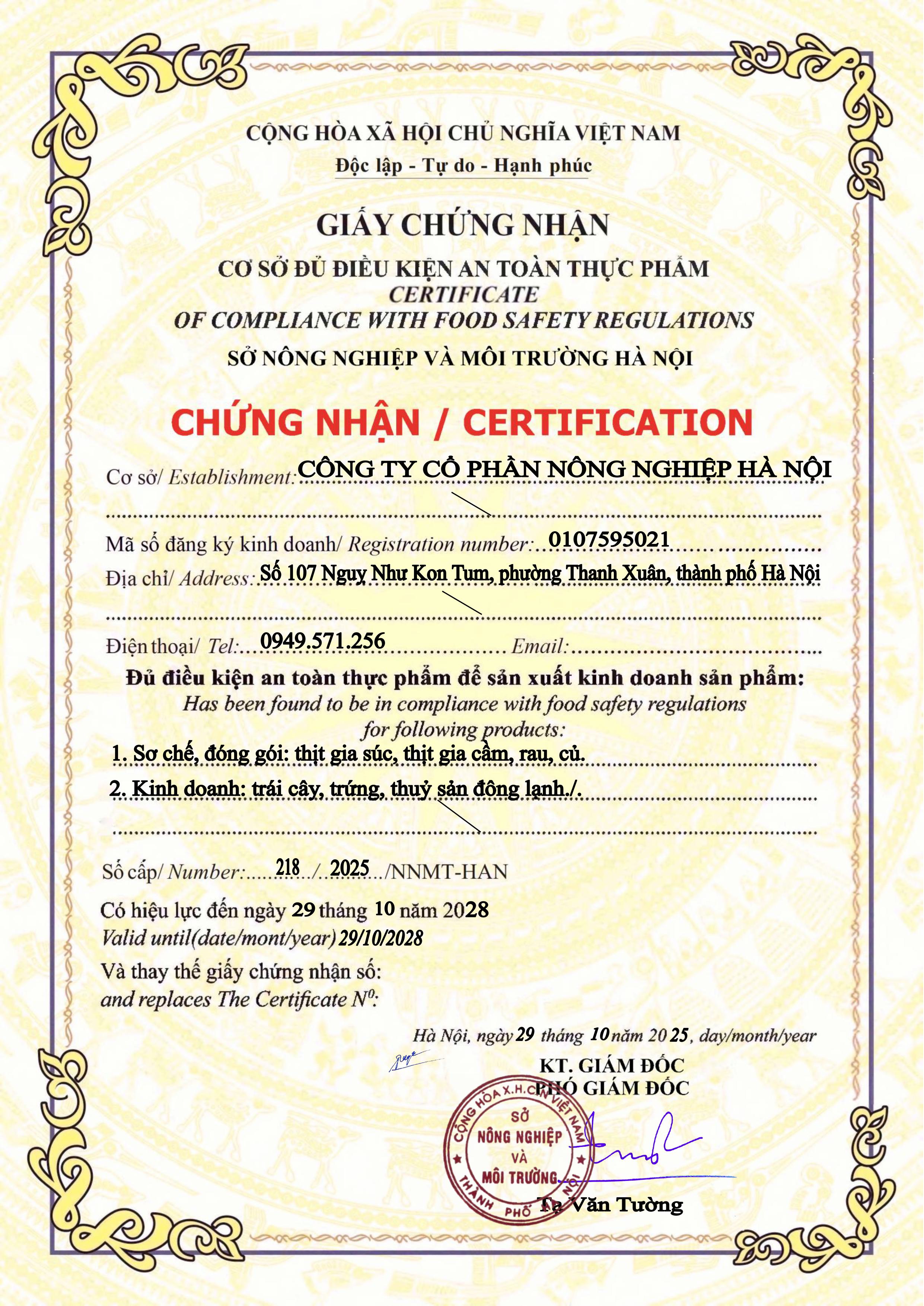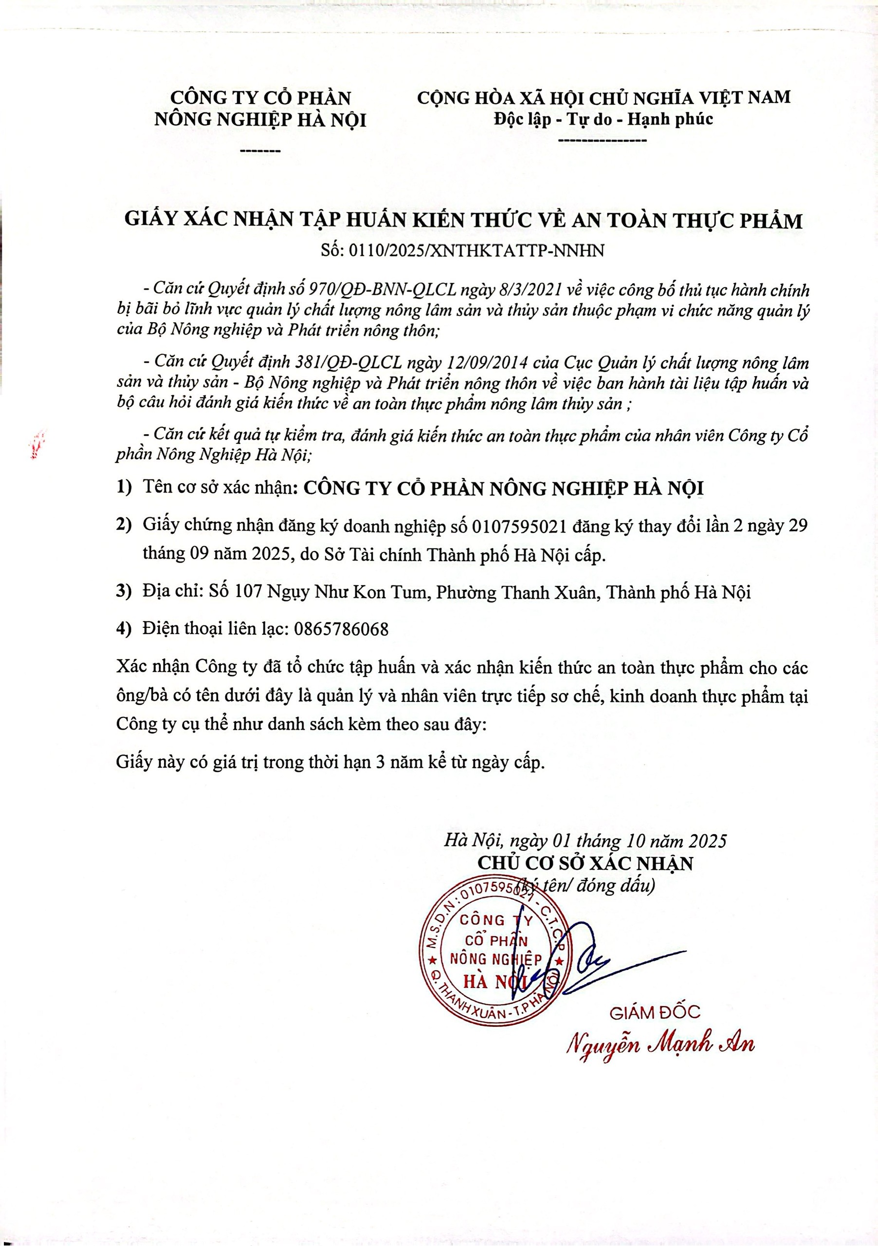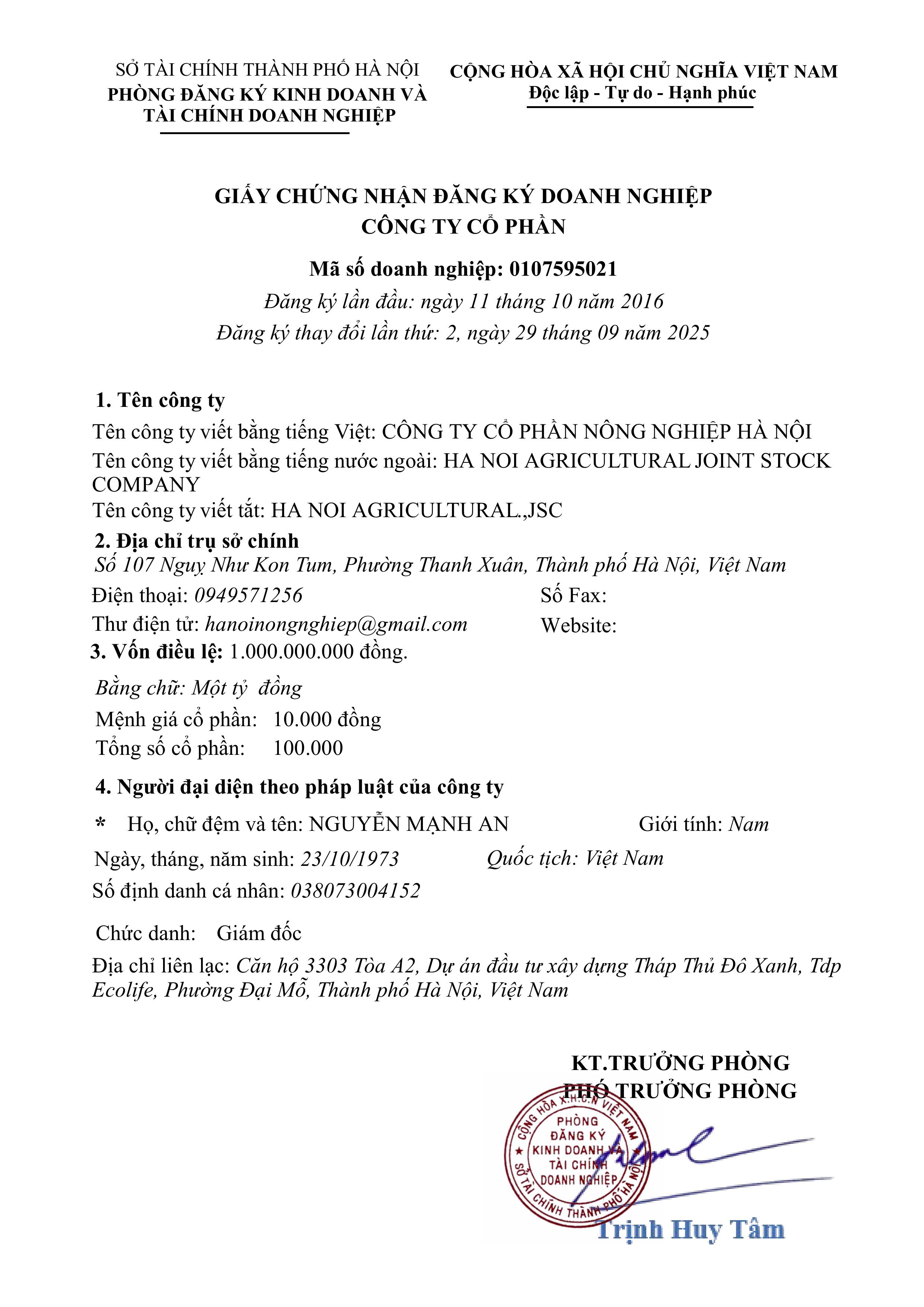 Tên đơn vị/nhà sản xuất: Công ty Cổ phần Nông Nghiệp Hà Nội