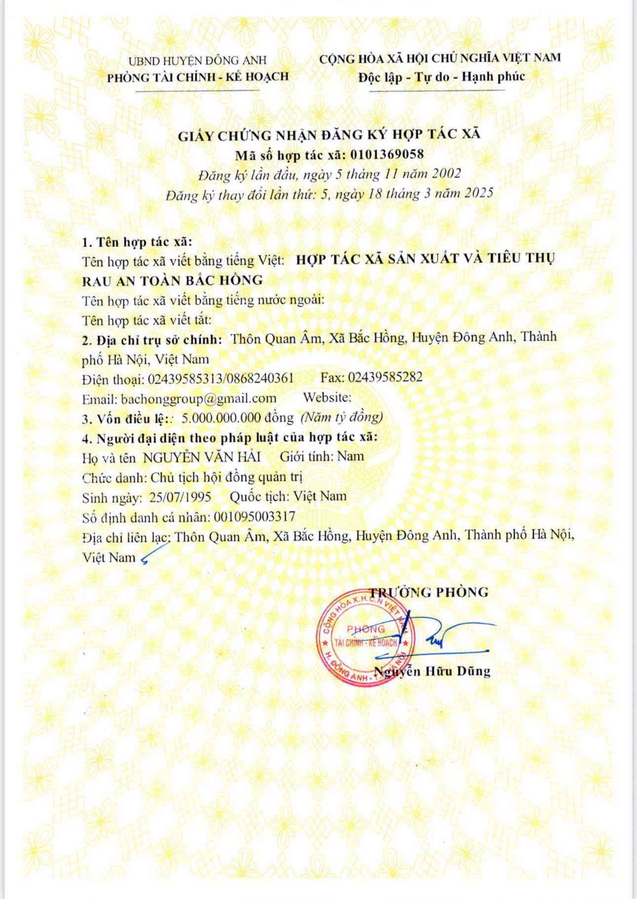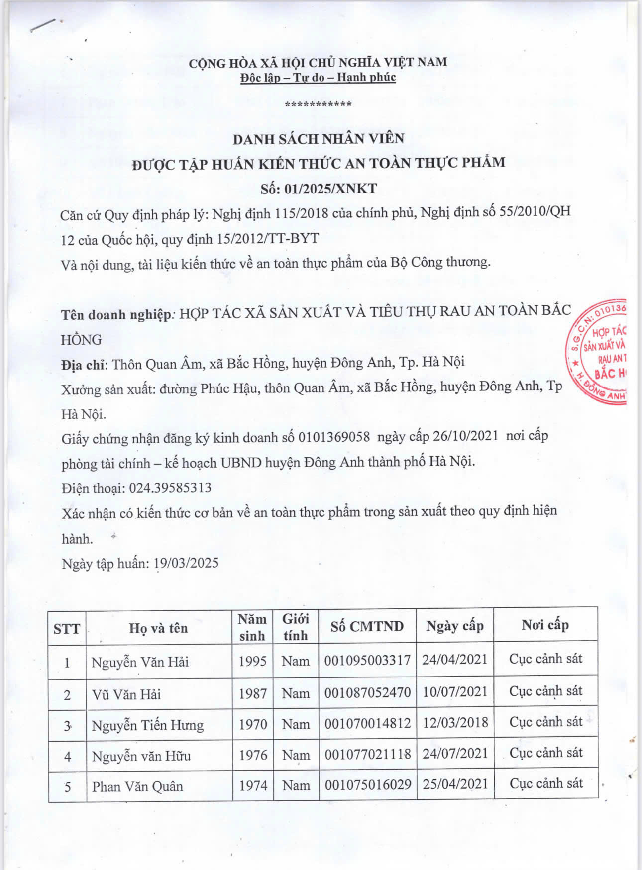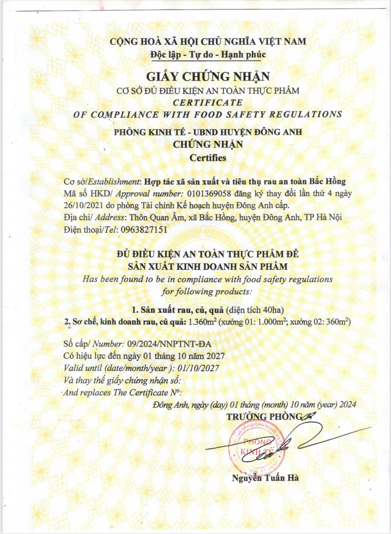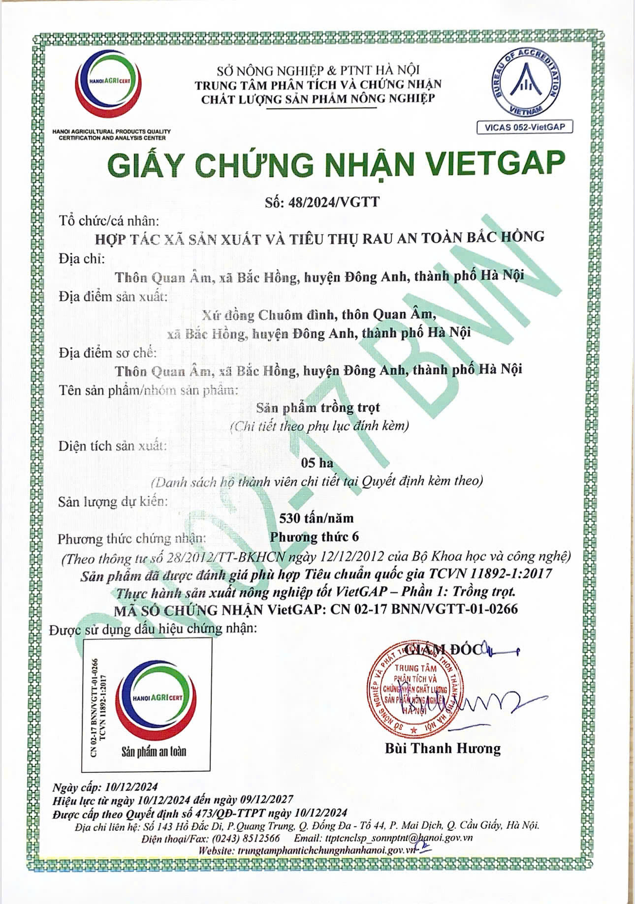 Tên đơn vị/nhà sản xuất: HỢP TÁC XÃ SẢN XUẤT VÀ TIÊU THỤ RAU AN TOÀN BẮC HỒNG