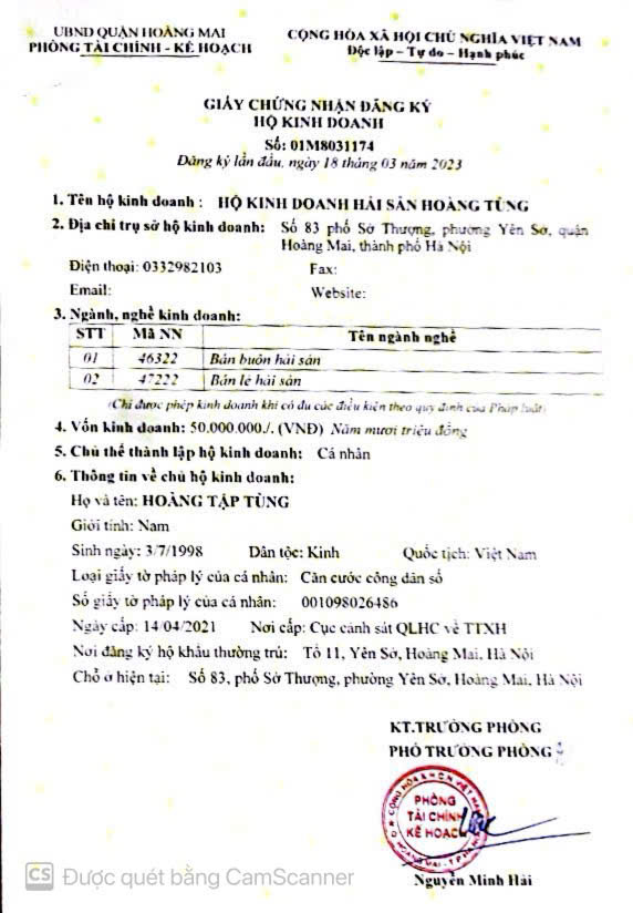 Tên đơn vị/nhà sản xuất: Hộ kinh doanh hải sản Hoàng Tùng