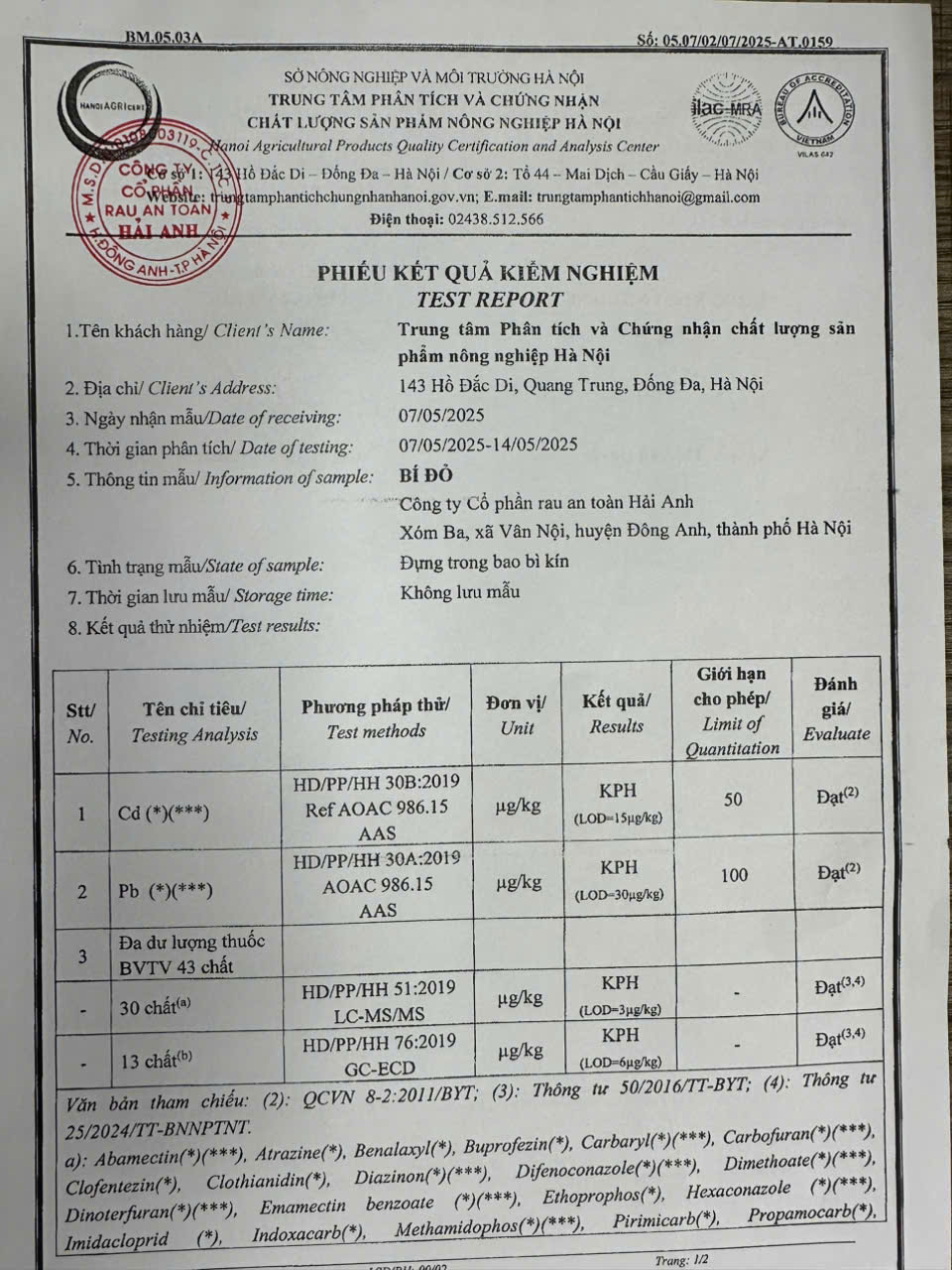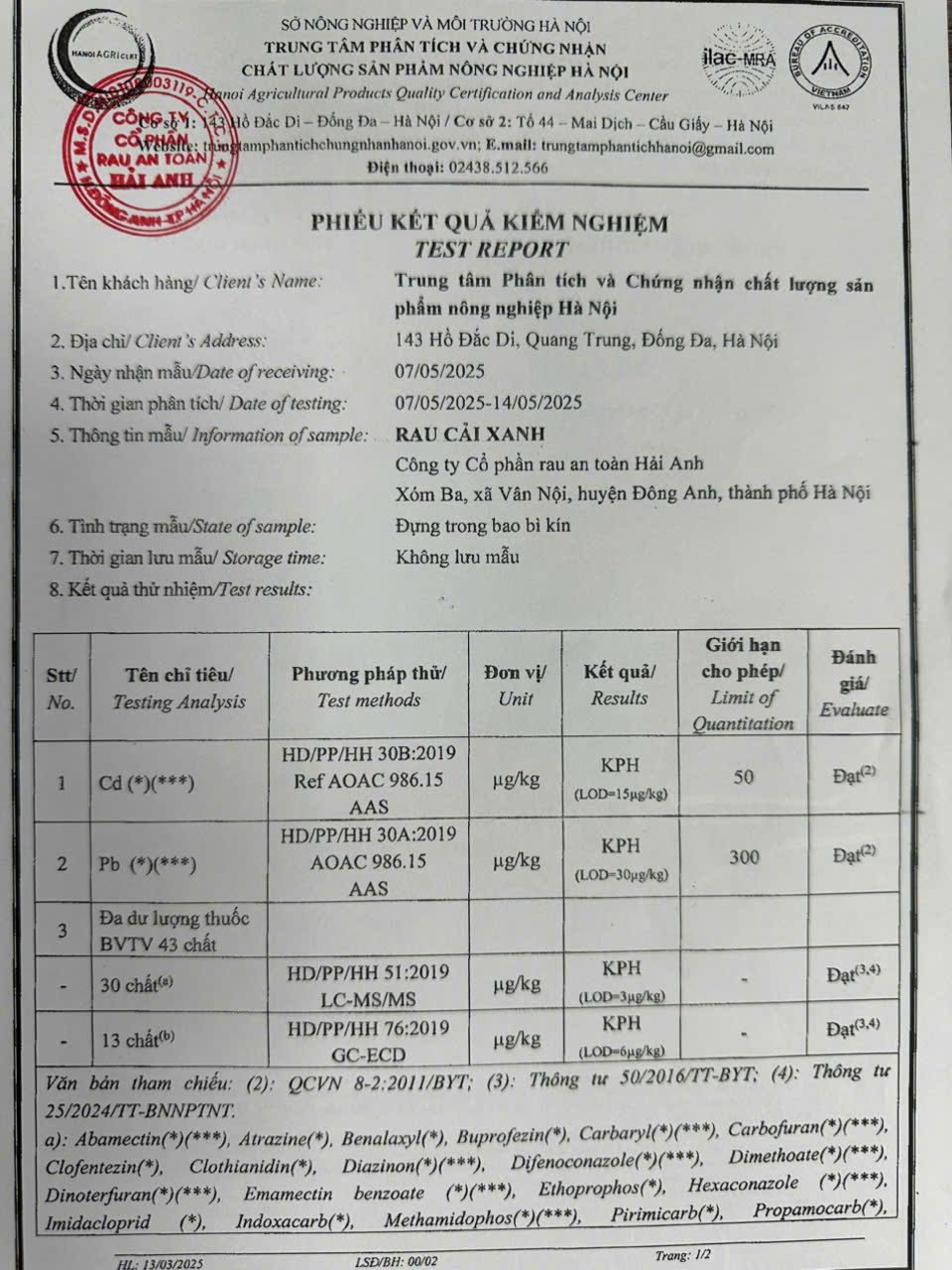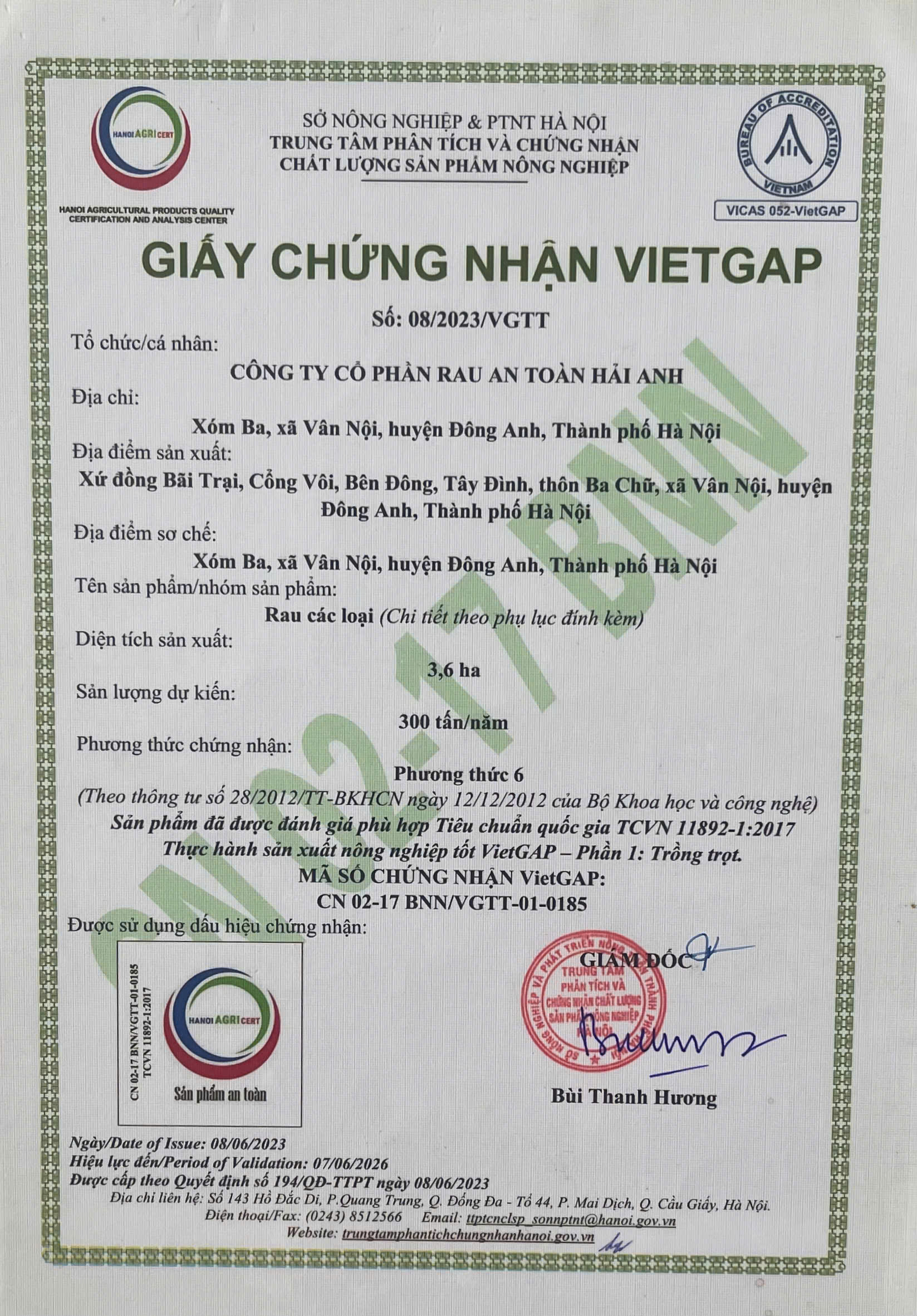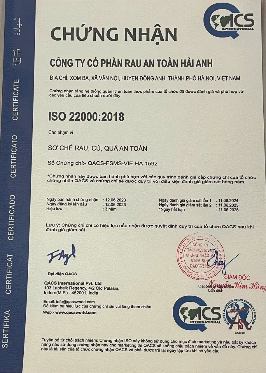 Tên đơn vị/nhà sản xuất: Công ty Cổ phần Rau An Toàn Hải Anh