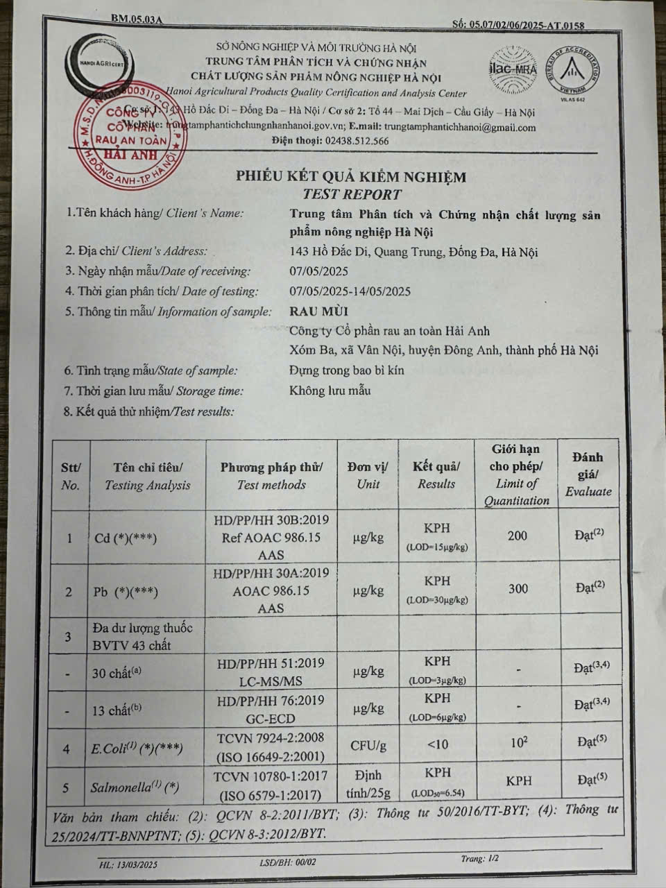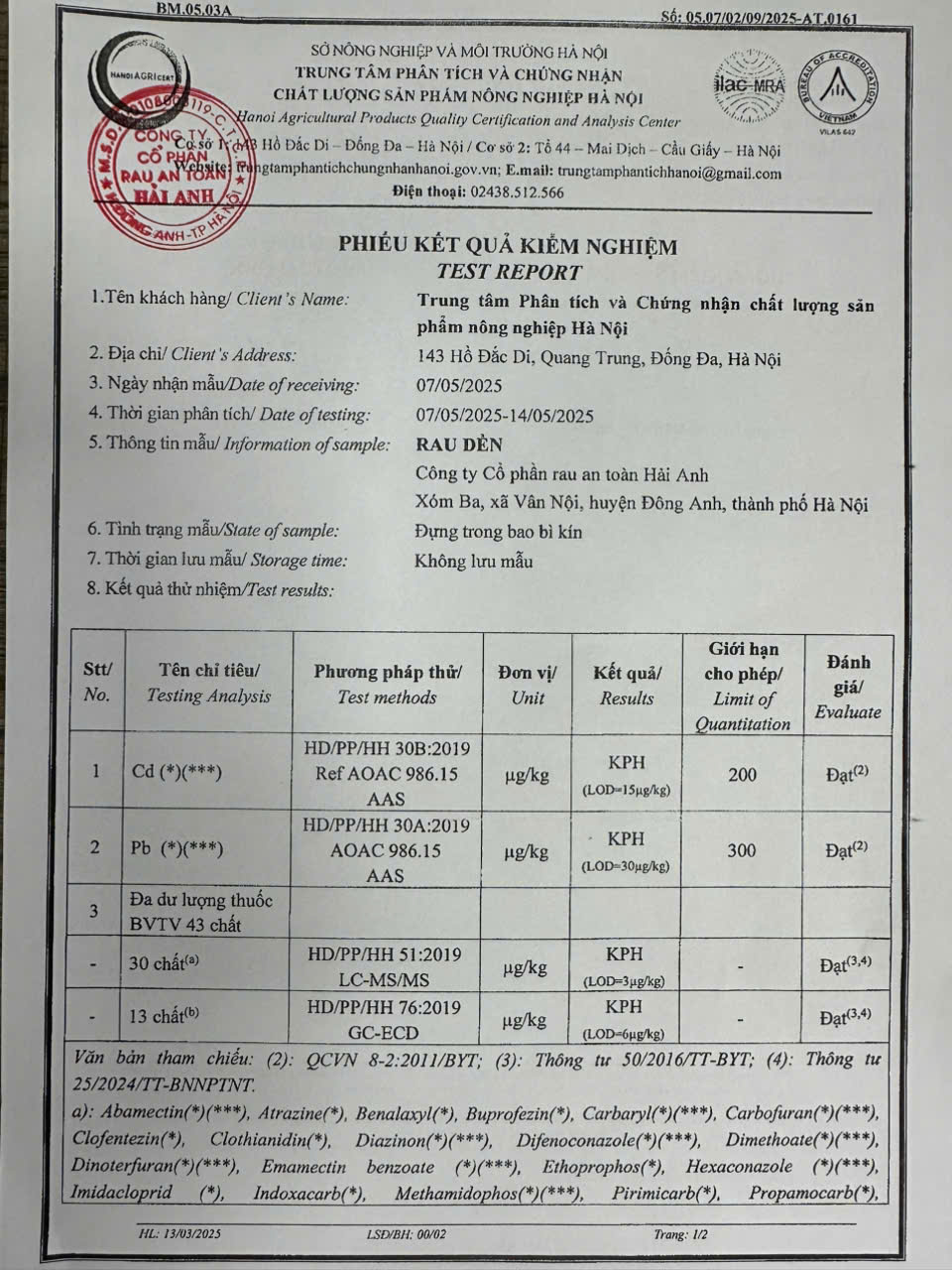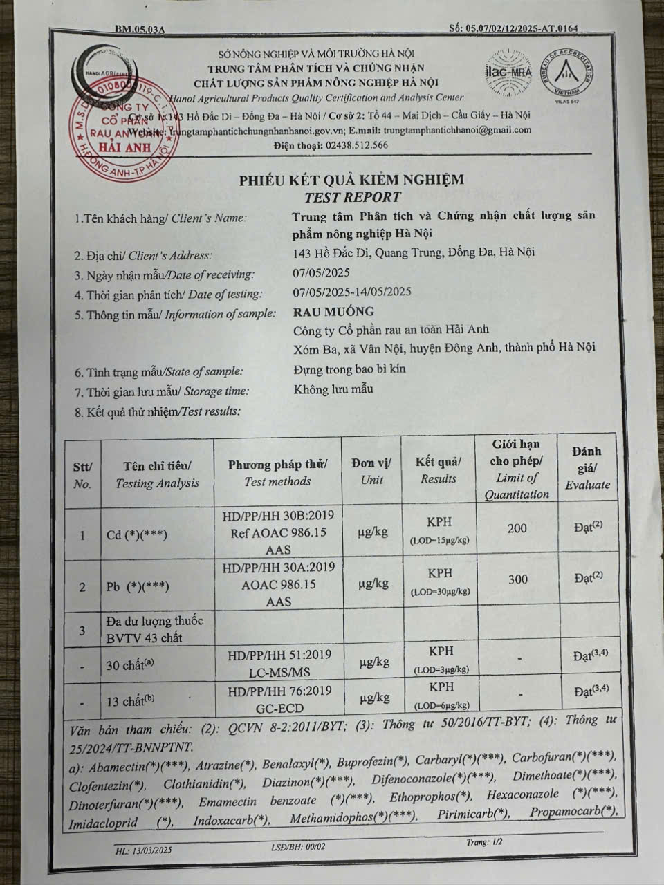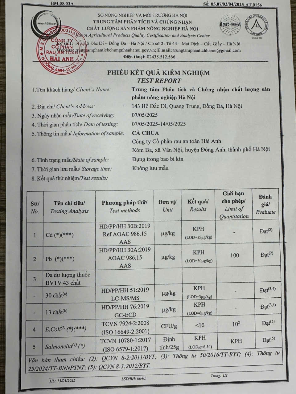 Tên đơn vị/nhà sản xuất: Công ty Cổ phần Rau An Toàn Hải Anh