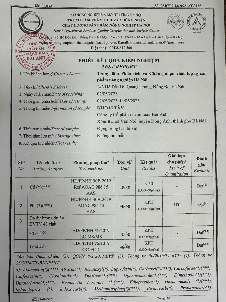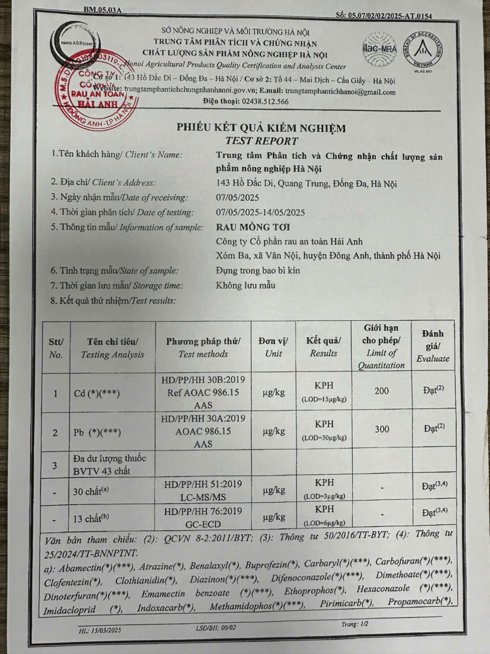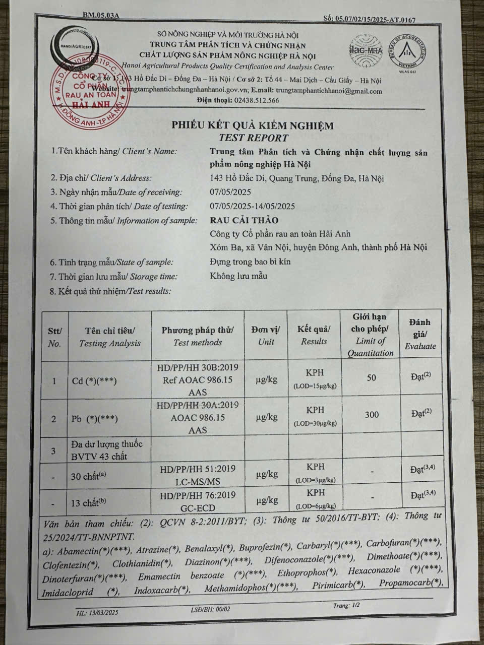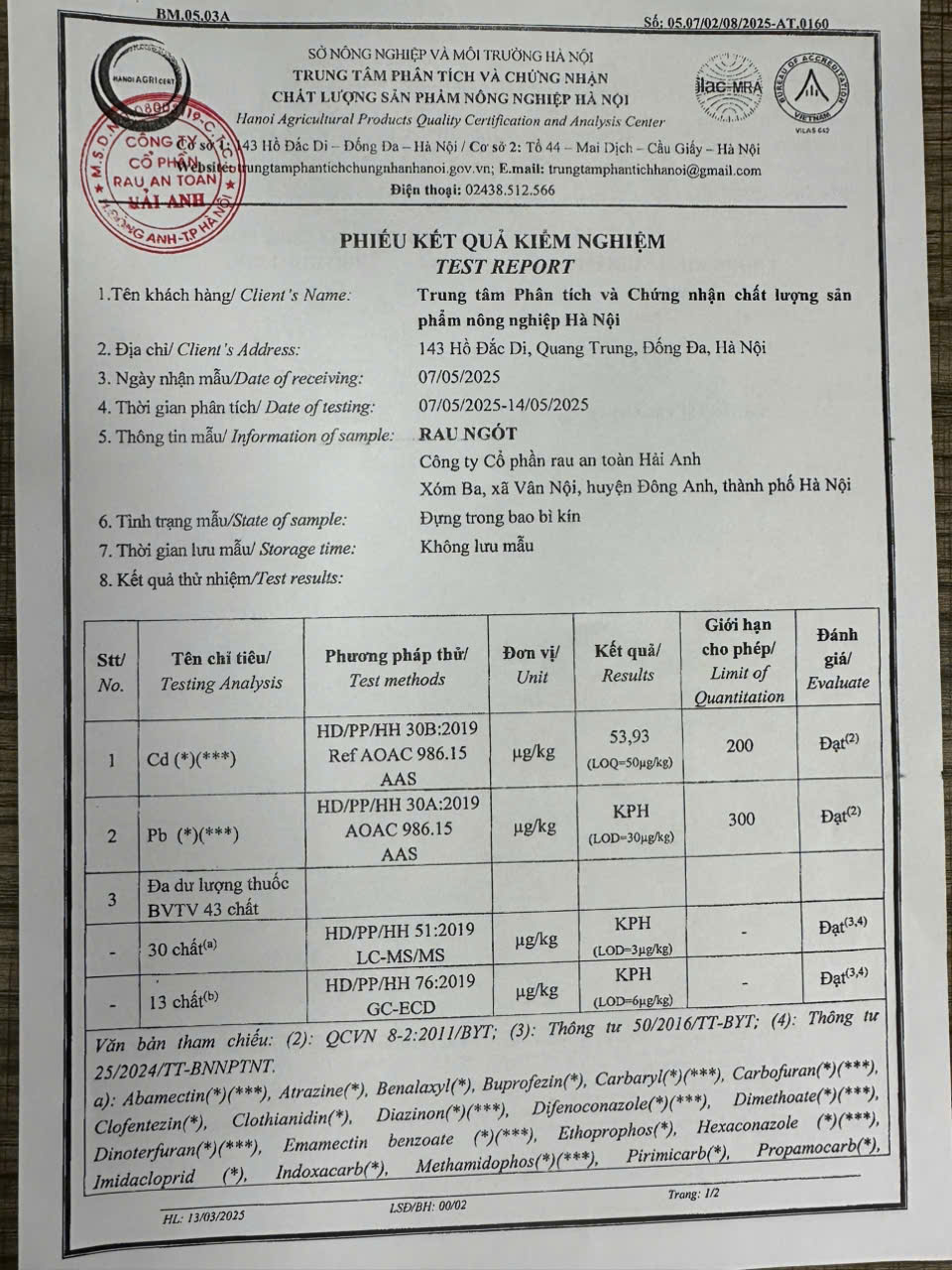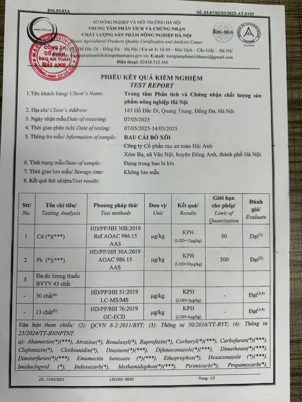 Tên đơn vị/nhà sản xuất: Công ty Cổ phần Rau An Toàn Hải Anh