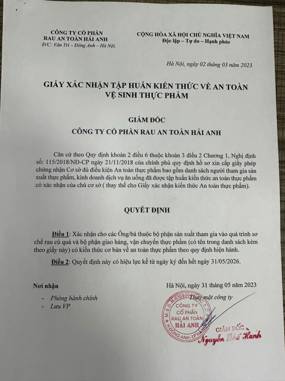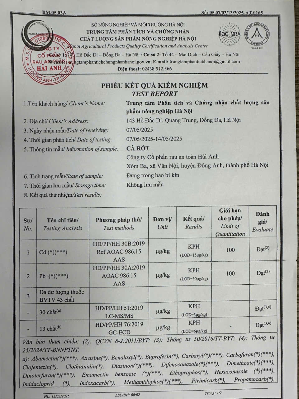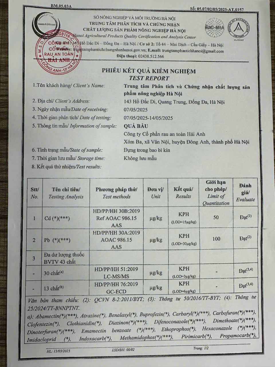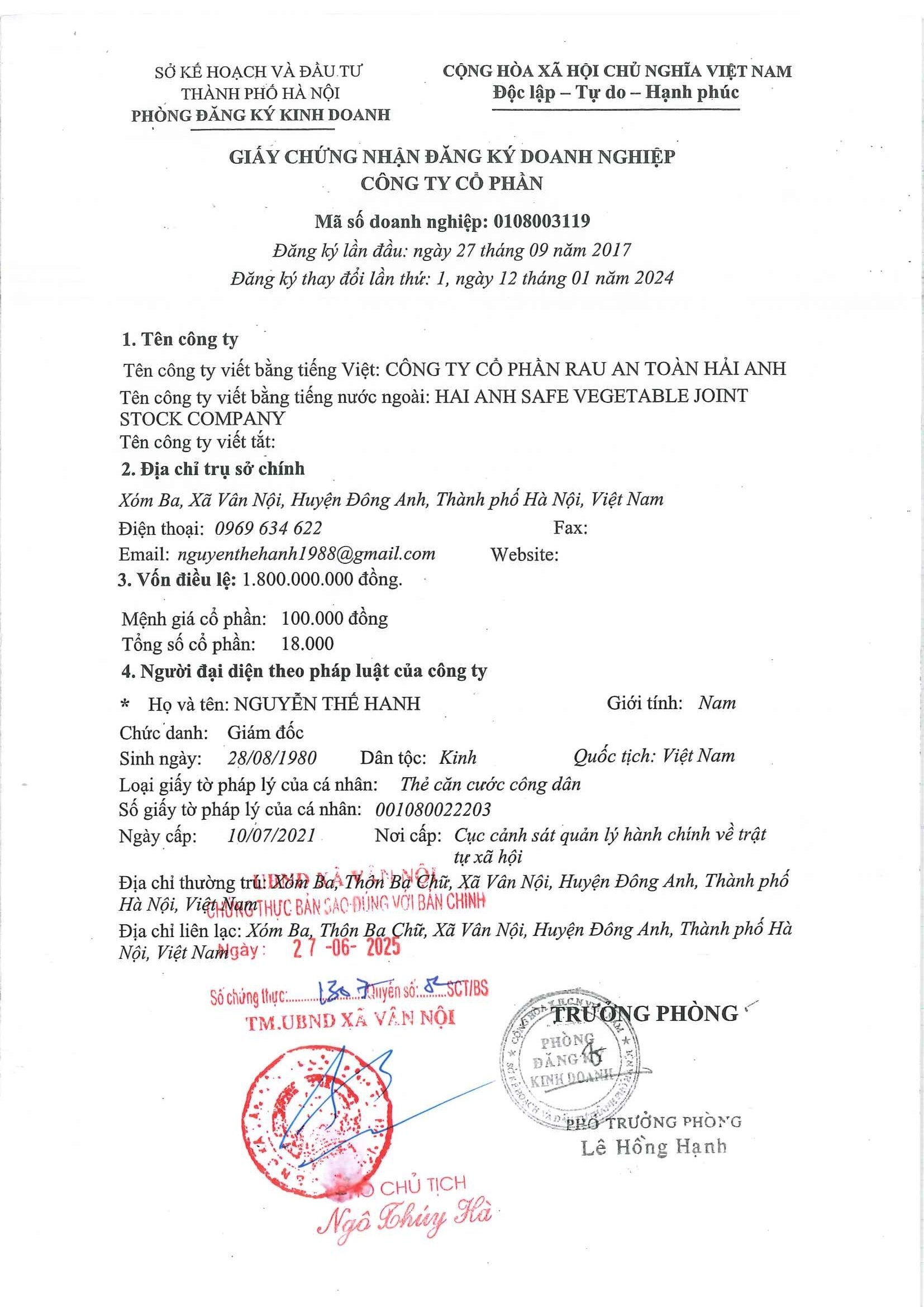 Tên đơn vị/nhà sản xuất: Công ty Cổ phần Rau An Toàn Hải Anh