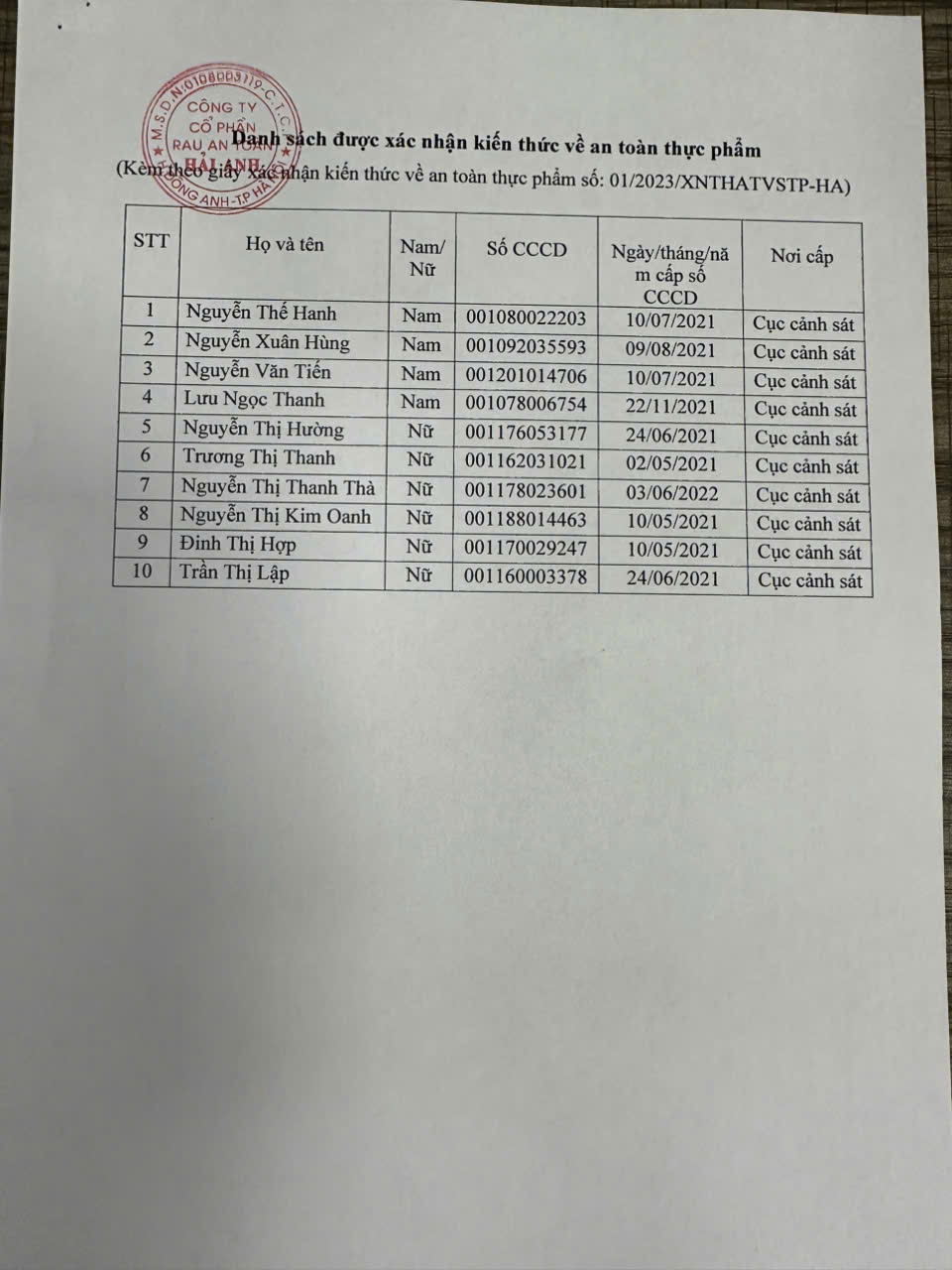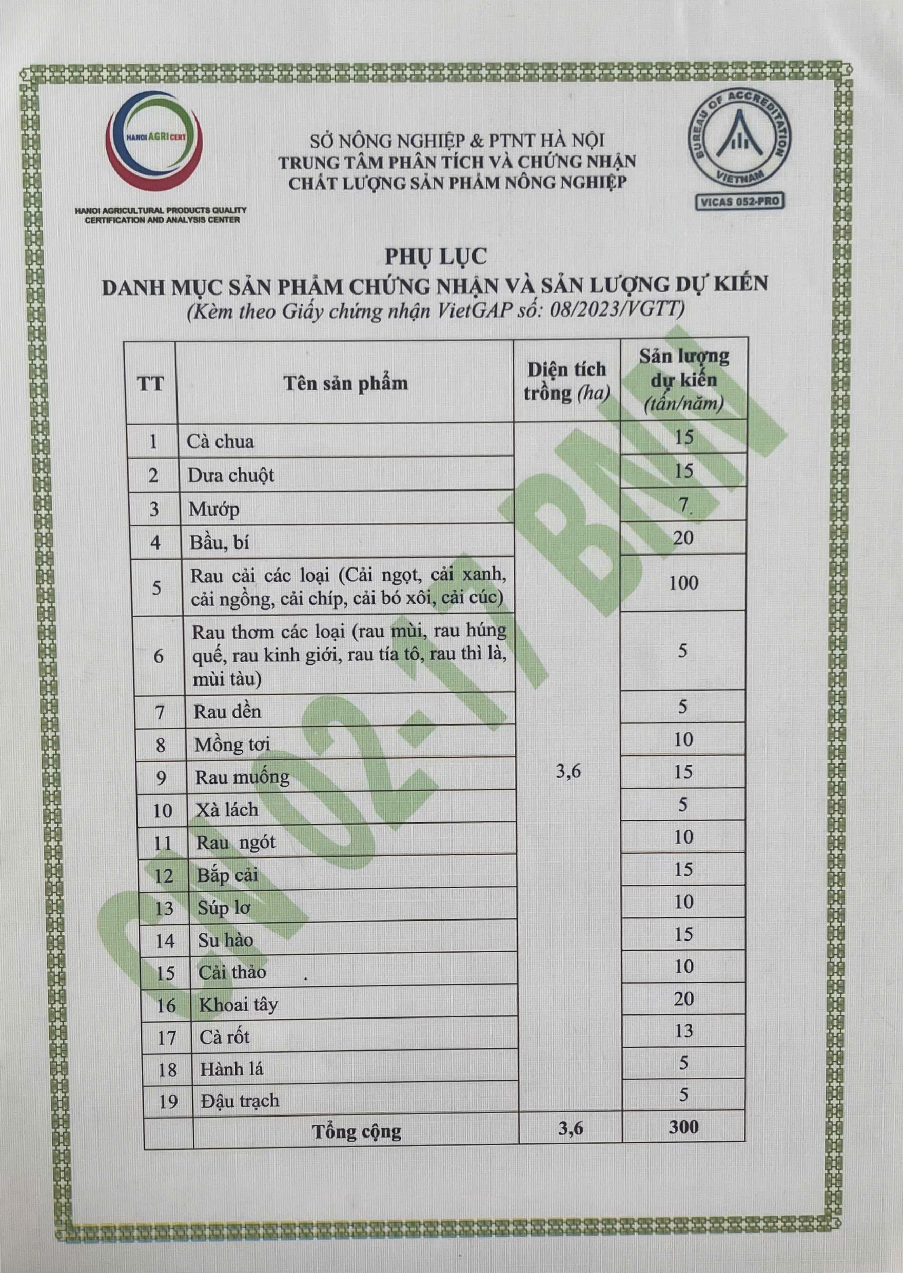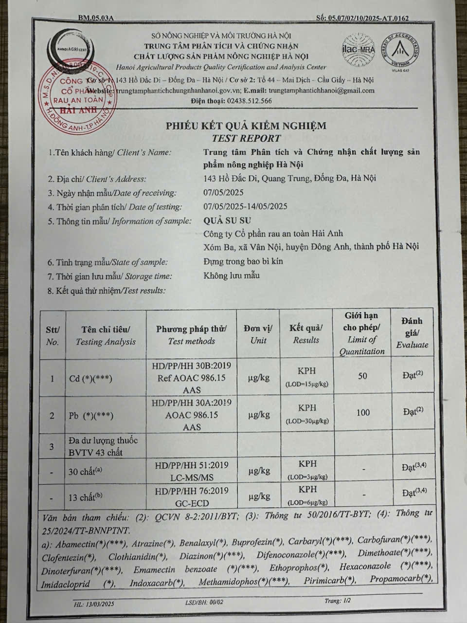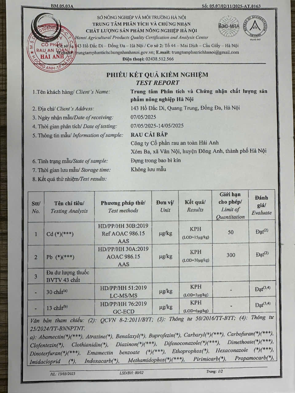 Tên đơn vị/nhà sản xuất: Công ty Cổ phần Rau An Toàn Hải Anh