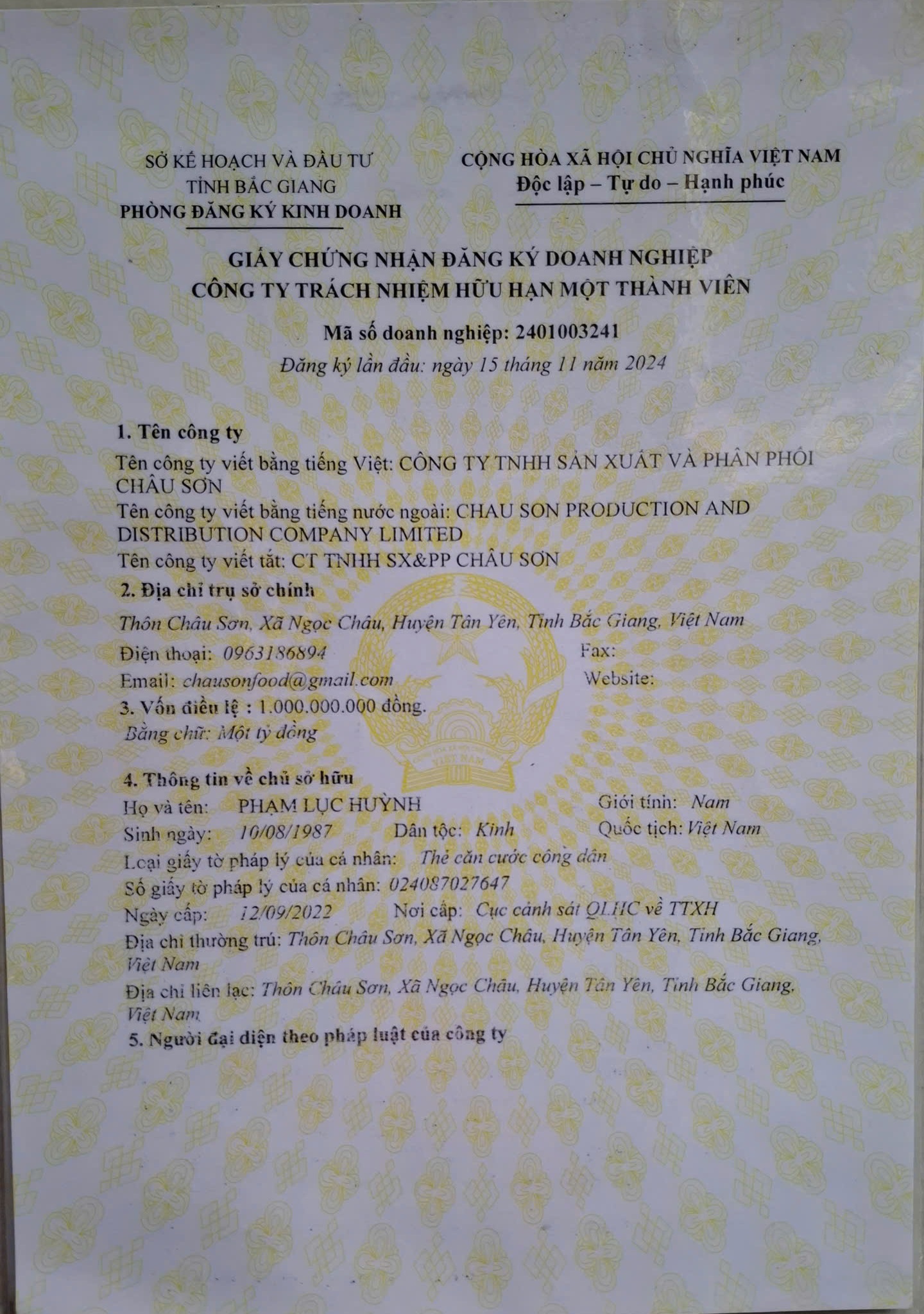 Tên đơn vị/nhà sản xuất: Công ty TNHH sản xuất và phân phối Châu Sơn