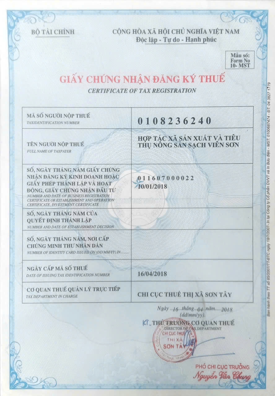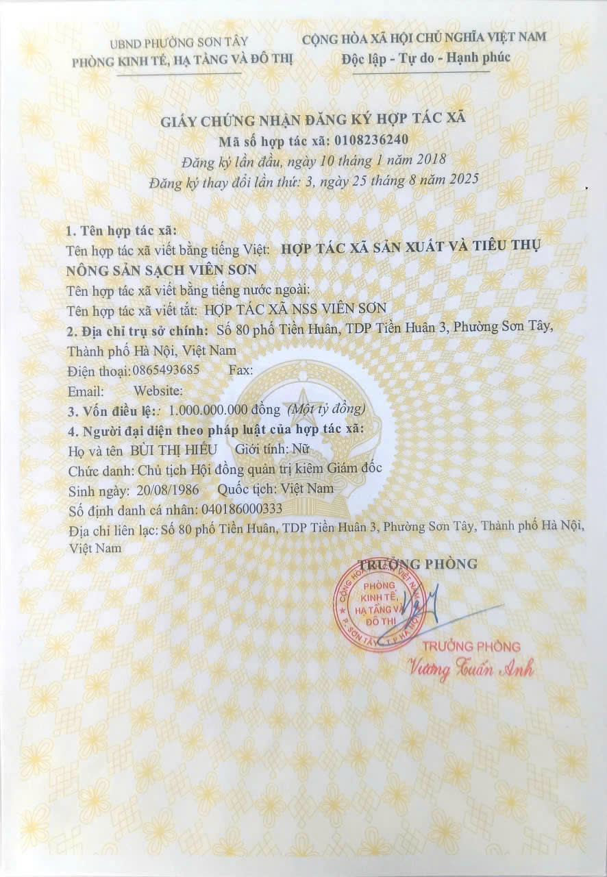Tên đơn vị/nhà sản xuất: Hợp tác xã sản xuất và tiêu thụ nông sản sạch Viên Sơn