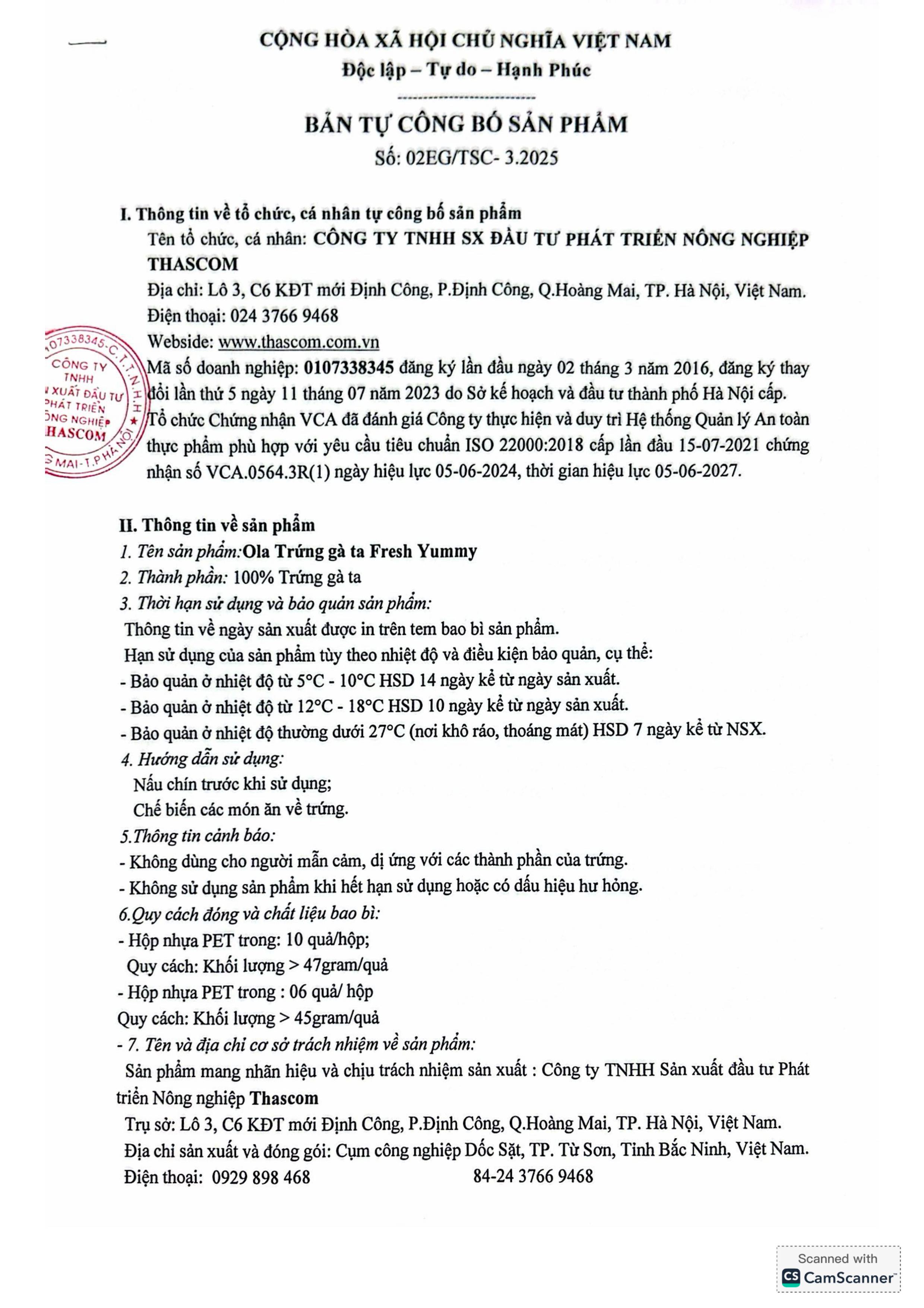 Sản phẩm trứng gà ta Ola - Thương hiệu sản phẩm của Thascom được sản xuất tại các hệ thống trang trại theo tiêu chuẩn An toàn vệ sinh thực phẩm sau đó được vệ sinh - làm sạch - đóng gói tại nhà máy sản xuất của Thascom theo tiêu chuẩn ISO 22000.