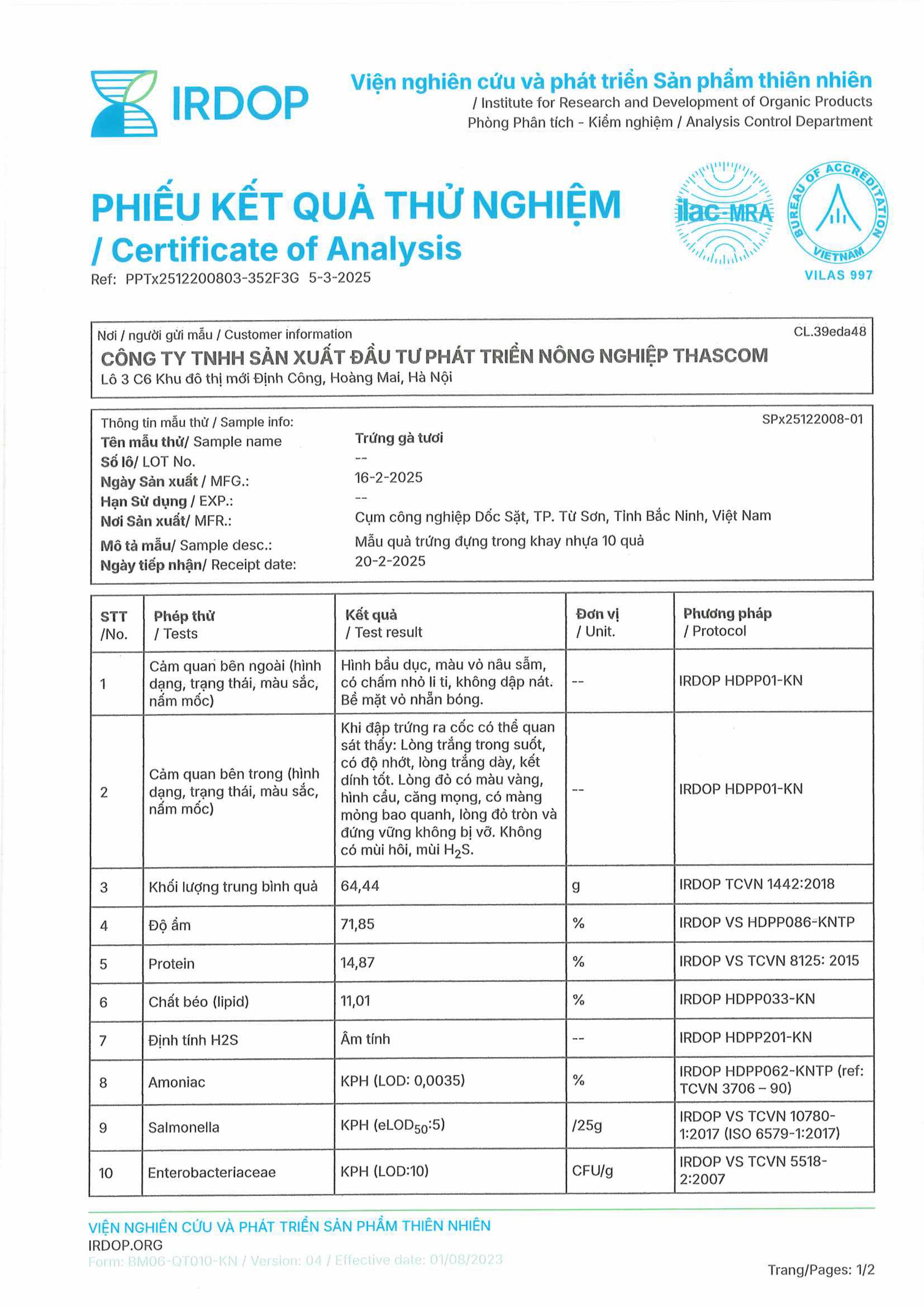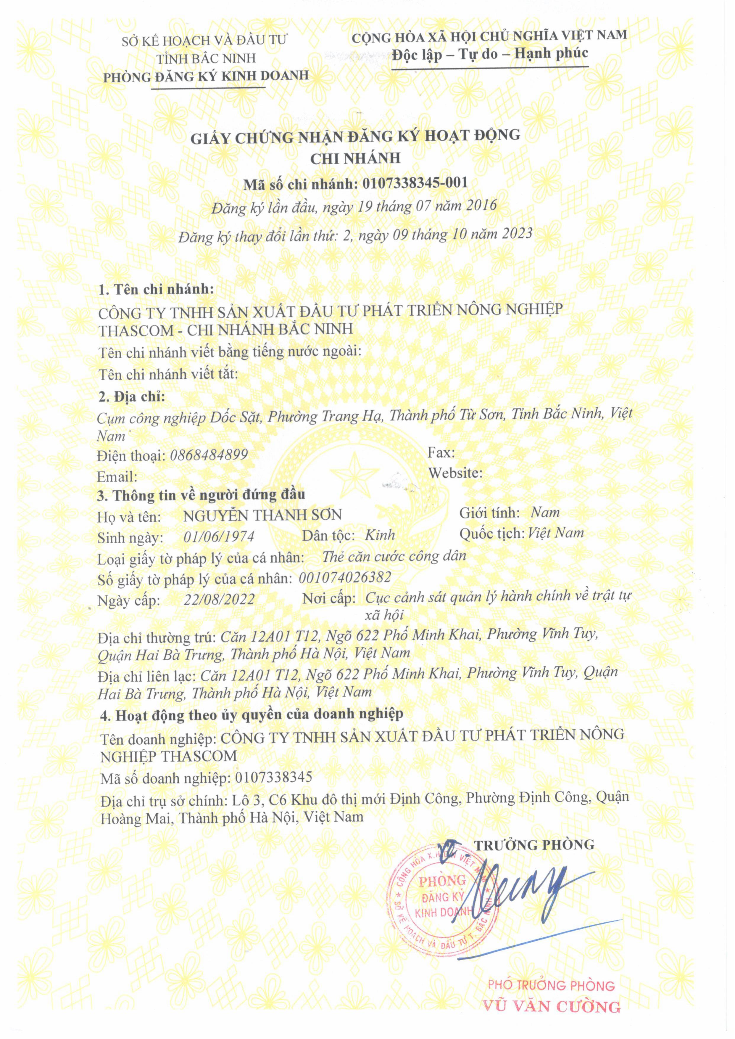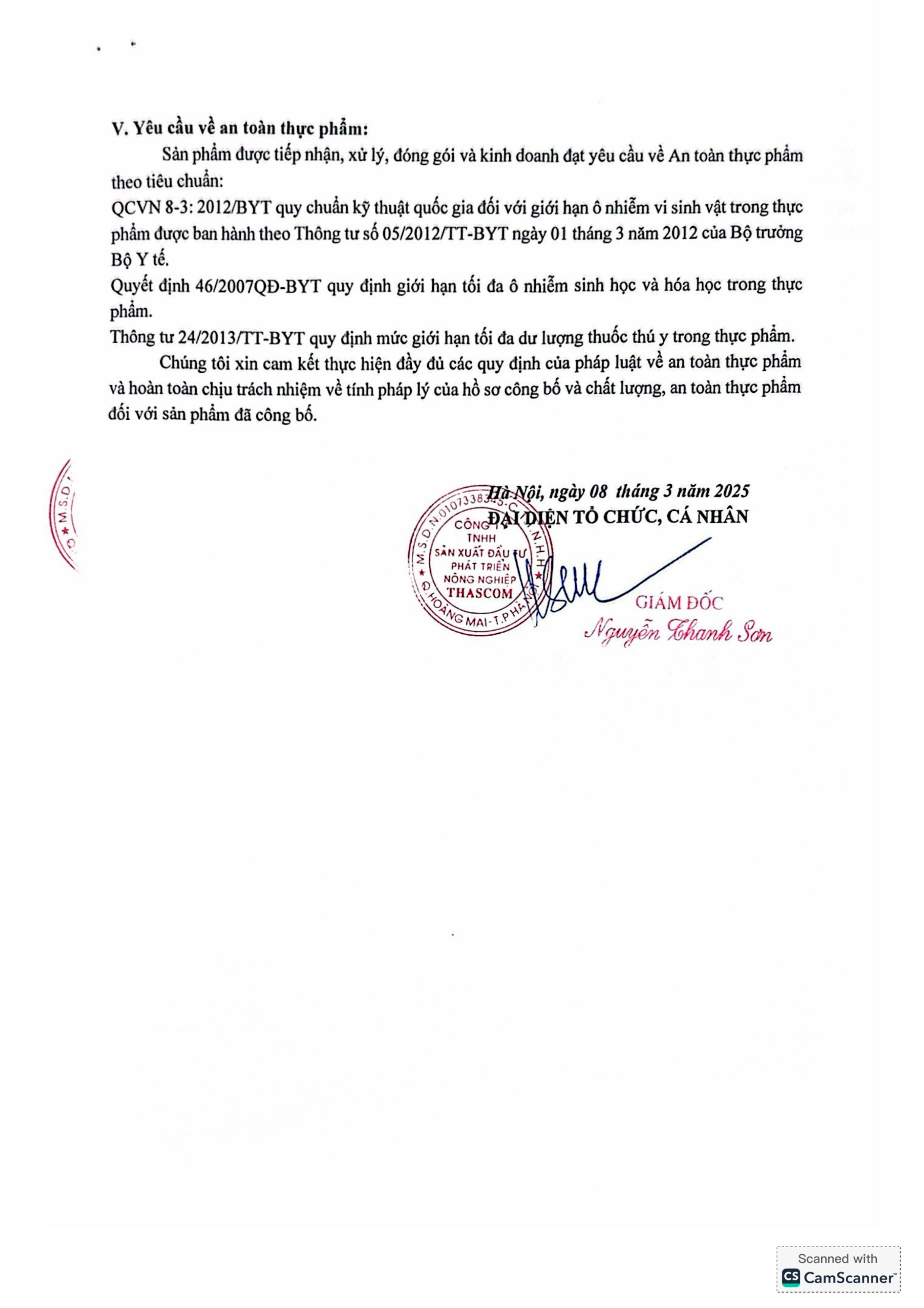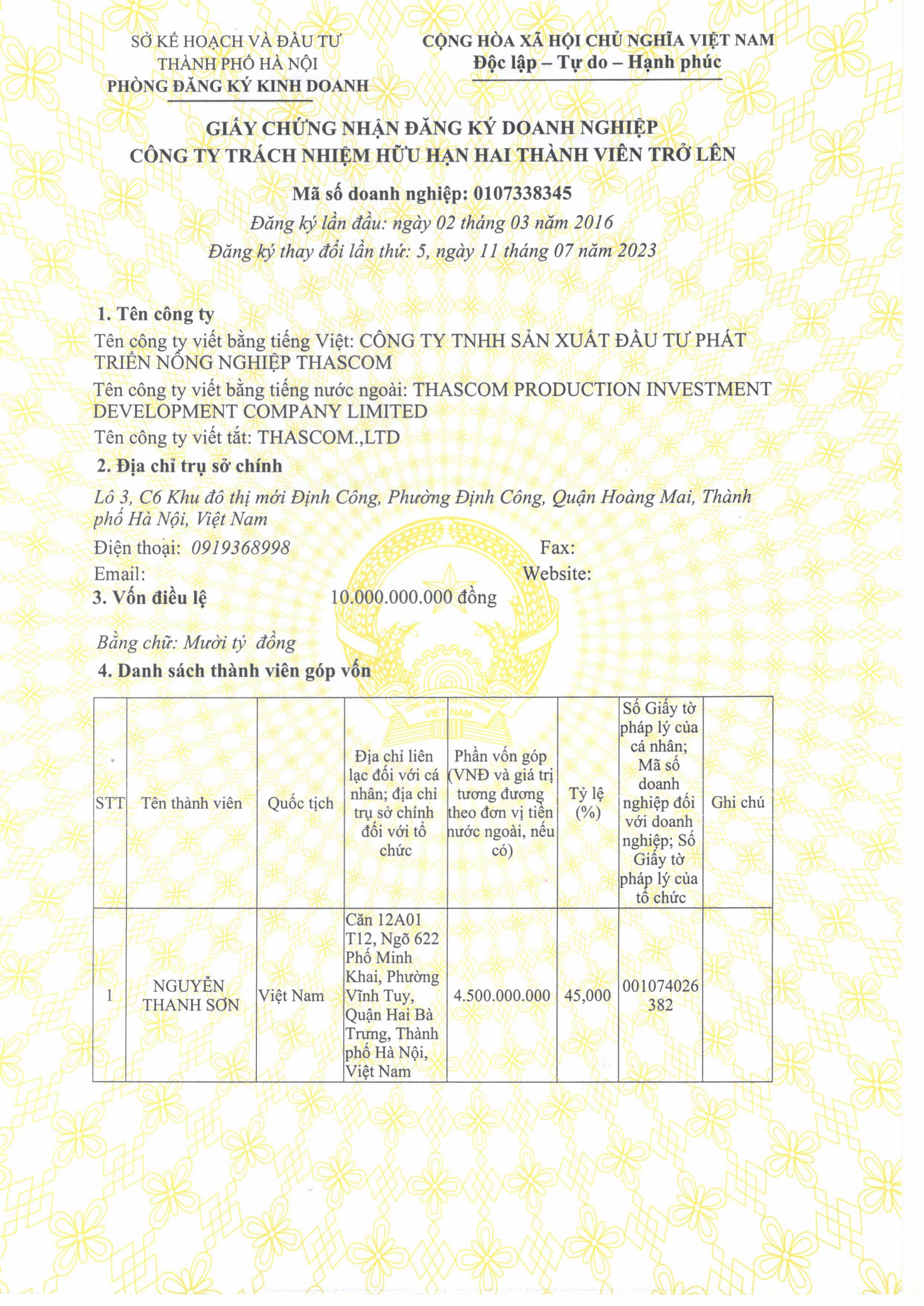 Tên đơn vị/nhà sản xuất: Công ty TNHH sản xuất đầu tư phát triển nông nghiệp THASCOM