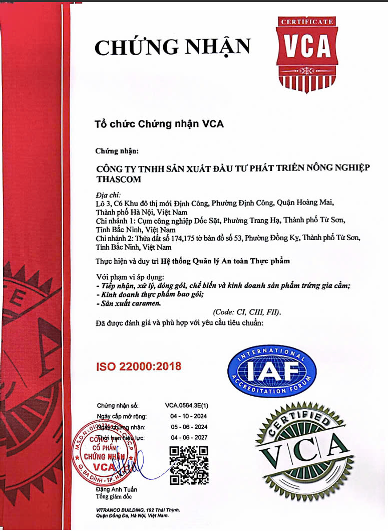 Sản phẩm trứng gà ta Ola - Thương hiệu sản phẩm của Thascom được sản xuất tại các hệ thống trang trại theo tiêu chuẩn An toàn vệ sinh thực phẩm sau đó được vệ sinh - làm sạch - đóng gói tại nhà máy sản xuất của Thascom theo tiêu chuẩn ISO 22000.